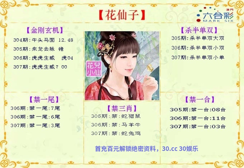 | 306期:【八仙过海】 【见说新桥好风景,怎解识天然图画,修完金鼎一溪云,始恍然火浮黎土】 解:意思是好风景解出风肖虎兔龙,金鼎解出金肖猴鸡 生肖:猪鸡羊兔狗牛 |