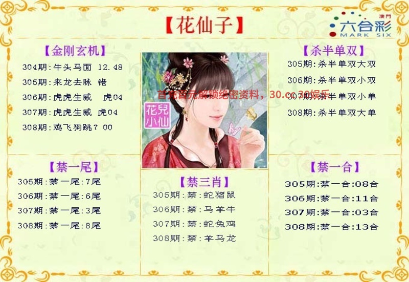 | 308期:【八仙过海】 【写向蛮笺曲调中,鸡鸣警戒了宁了,南崔寂寞三春晚,水多孤米岸莓苔】 解:意思是三春解出春肖虎兔龙,水解出水肖鼠猪,鸡鸣解出明肖鸡 生肖:马羊猴牛兔虎 |